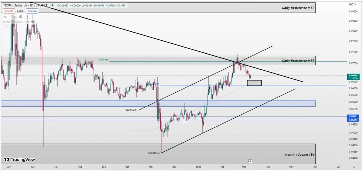 رمز ارز ترون هفته گذشته با فشار فروشی که در بازار ایجاد شد، نتوانست از محدوده مقاومت خود در قیمت 0.069 الی 0.072 دلار عبور کند، و به دلیل توالی مقاومتها در این محدوده، واکنشهای منفی زیادی نشان داد. با تشکیل الگوهای بازگشتی مانند سقف دوگانه، شاهد کاهش قیمت این ارز بودیم. با توجه به کاهش تقاضا، یک حمایت در محدوده 0.062 الی 0.064 دلار در نظر گرفته شده بود، که این سطح توسط فشار فروش شکسته شد.