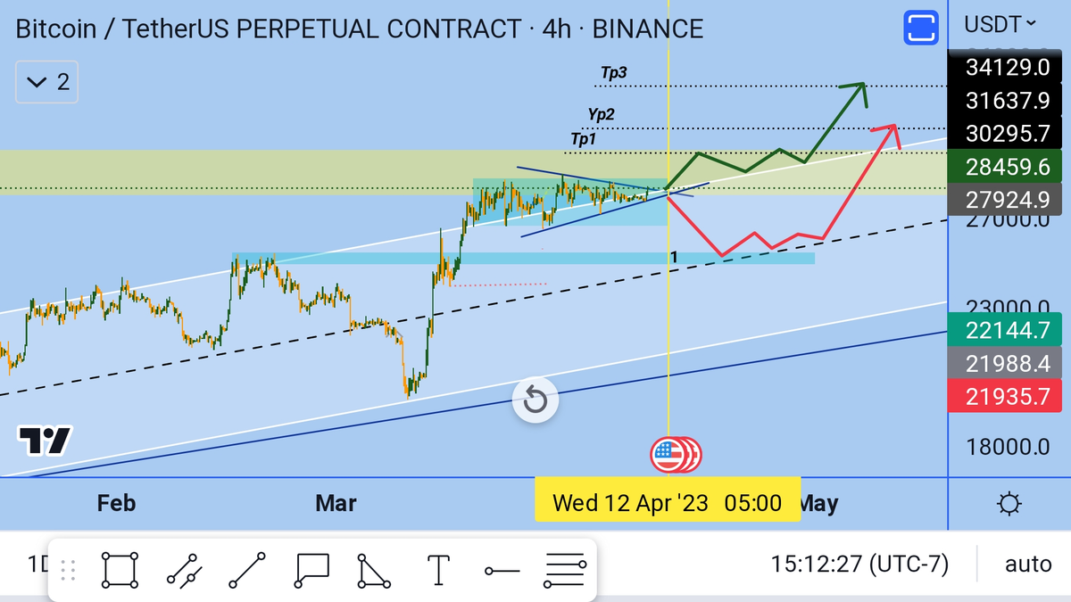 بیت کوین در بلند مدت در کانال صعودی قرار گرفته در زمان نگارش این تحلیل در حال ساخت الگو هستش که در محدوده خط زرد رنگ به تاریخ ایران ۲۳ فروردین منتظر اعلام نرخ بهره سالانه آمریکا قرار گرفته که پیش بینی های کارشناسان مبنی بر این است از عدد ۶ به ۵/۵برسه این امر موجب رشد بازارهایی مثل بورس شده در صورت تایید این موضوع بورس سال خوب و تجربه خواهد کرد وبیت کوین میتونه به روند صعودی خودش ادامه بده و تاریخ ساز بشه ولی چنانچه نرخ بهره بیشتر اعلام بشه بازارهای مالی یه اصلاح و مجددا به رشد نه چندان مطلوب خودشون ادامه خواهند داد.