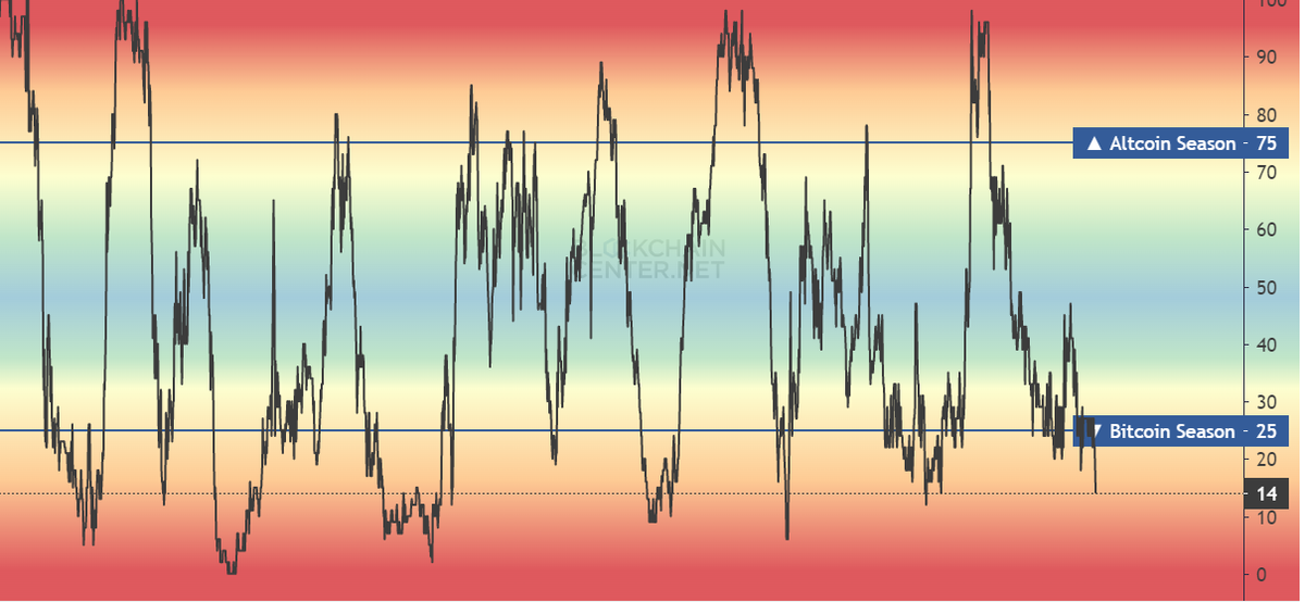 در حال حاضر این ایندکس به عدد 14 رسیده و کمکم اگه روند بیت کوین نزولی نشه شاهد رشد سریع آلت کوین ها میشیم