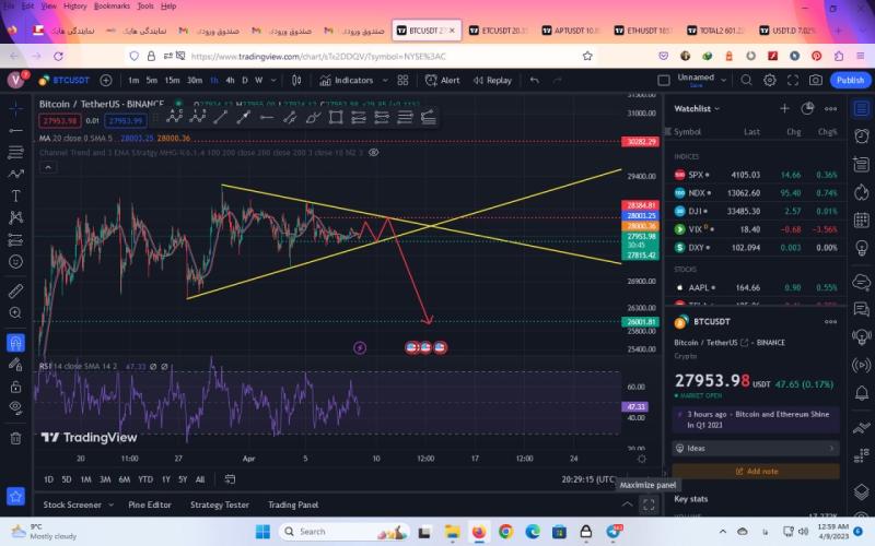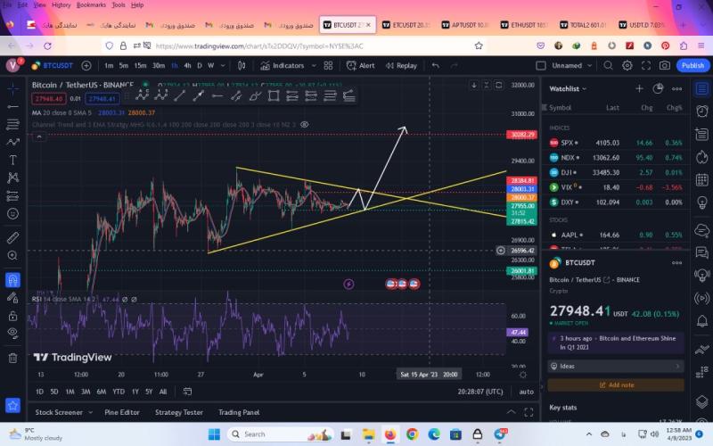 تو بیت کوین خط حمایت و مقاومتی که مشخص کردم بخورد های سومش هستش باید ببینیم تو مقاومت و حمایت بعد از بخورد به خط حمایت و مقاومت آیا این خط حمایت بعد از برخورد سوم چه واکنشی نشان خواهد داد و بار چهارم بعد از برخورد باید انتظار شکست رو داشته باشیم حالا چه تو حمایت چه تو مقاومت. خط حمایت عدد 27800 تا 27700 هستش که با برخورد به این ناحیه بیت کوین حمایت خواهد شد و تو عدد 28300 و 28400 مقاومت هستش که با برخورد به این ناحیه واکنش رو به پایین رو خواهیم داشت و بعد از اون باید ببینیم به کدوم ور شکسته خواهد شد به سمت پایین یا بالا. فعلا تو این ناحیه که خط کشیدم بازی خواهد کرد و رنج خواهد زد تا فردا هم و بعدش باید شاهد شکست باشیم حالا کدام سمت به نظر من با شروع بازار بعد از تعطیلات آخر هفته تکلیف این موضوع مشخص خواهد شد یا فردا شب یا پس فردا