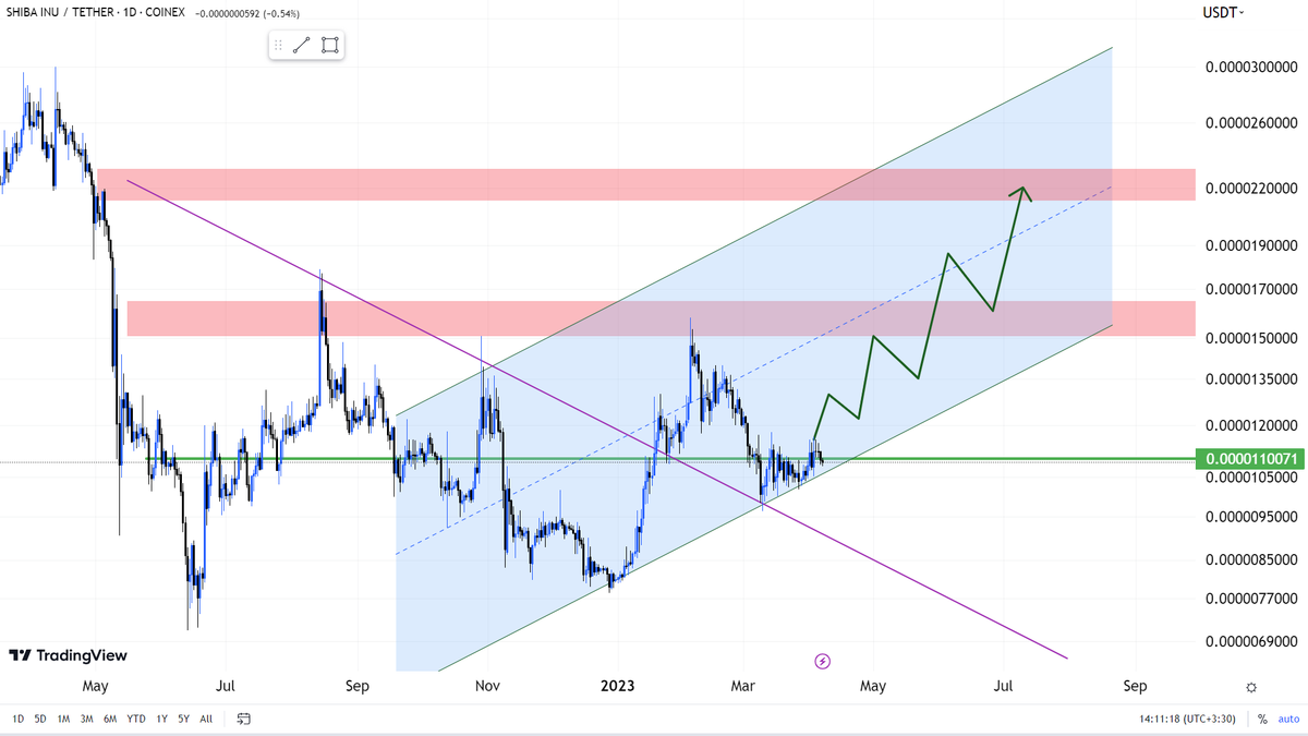 شیبابعد از خارج شدن از مثلت نزولی ، یک کانال صعودی تشکیل داده که در حال حاضر قیمت به کف کانال که هم ناحیه حمایت خوبی محسوب میشه واکنش نشون داده.سناریومشخص شده می تواند تارگت و اهداف شیبا در چند ماه آینده باشد.