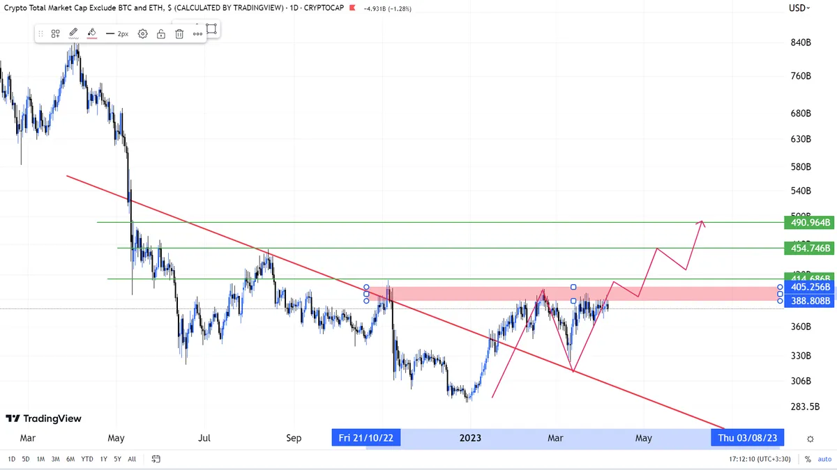 توتال 3 کریپتو که در واقع شاخص رشد آلت کوین ها محسوب میشه درگیر کارکشن صعودی است اگر ناحیه قرمز را تثبیت کند اهداف مشخص شده را طبق سناریو معین شده به ترتیب تاچ خواهد کرد.این اتفاق بیفتد آلت کوین ها رشد خوبی خواهند کرد.