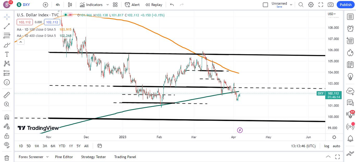 طبق تصویر شاخص دلار در زیر میانگین 400 روزه در حال تثبیت شدنه که به نظر من این خودش نشون میده که دولت آمریکا تمایلی به افزایش نرخ بهره زیاد و غیره نداره، از طرفی هم تریدرها و بانکها در حال فروش دلارهای خودشون هستن و این کار میتونه سرعت بیشتری هم پیدا کنه (البته باید خبرها رو هم مد نظر قرار بدیم)