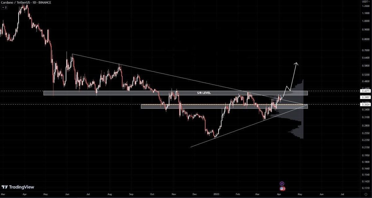 کاردانو تلاش می کند تا از مثلث متقارن خارج شود. حجم عالیه که نشان میده از ناحیه اصلی مقاومتش میتونه عبور کنه و تنها مانع نهایی در مسیر #صعودی خود مقاومتش هست