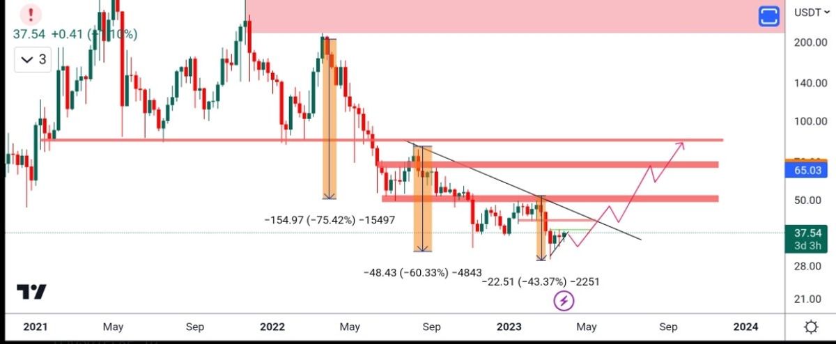 میتونه یک پایین دیگه بزنه برای تست سطح حمایتی ۳۰ دلار و جمع کردن بقیه اردهای لانگ و شروع موج صعودی اهداف روی نمودار مشخص شده