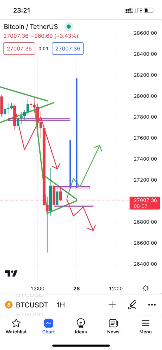طبق الگوی مثلث ،فعلا باید صبر کنیم تا کندل ها به اخرین کف برسند اونوقت تصمیم خود رو برای ادامه روند بگیریم .دو تا احتمال وجود دارد، یا بیتکوین اخرین مقاومت رو میشکند و پولبک و حرکت می زند که طبق چیزی که مشخص کردم یا به اندازه دسته پرچم یا به اندازه محدوده کانال میشه ازش buyبگیریم ، یا اخرین کف را میشکند و به اندازه باز دسته پرچم یا محدوده کانال میریزد و میشودsellبگیریم. فعلا باید صبر کرد. البته اینم بگم الگوی مثلث وسط چارتی هست و معامله اسکلپ هست بنابراین ریسک این الگو بالا هست