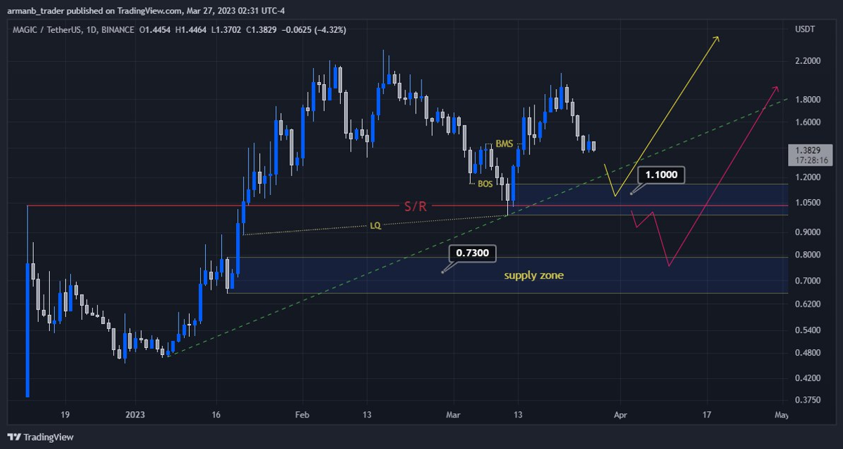 قیمت دو محدوده حمایتی مناسب دارد ( 0.73 - 1.10 ) و بعد از رشد مناسبی که داشته به صورت فشرده در حال رسیدن به این نواحی میباشد ، و بعد از دیدن تریگر مناسبه برای خرید به صورت اسپات ، دو سناریوی صعودی احتمالی در چارت مشخص میباشد.