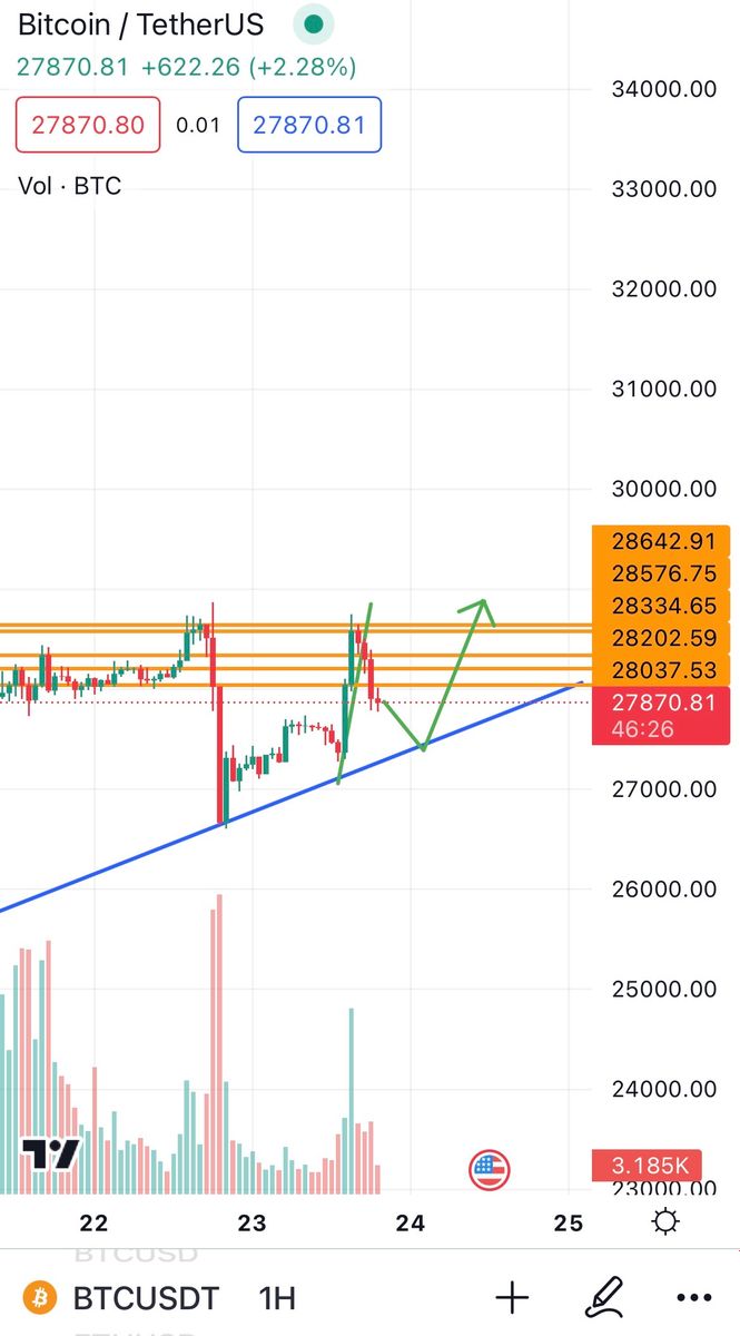 همونطور که میبینید در تایم فریم یک ساعته فعلا بیت کوین به نزول ادامه میده تا به خط روند صعودی برسه و دوباره شروع به صعود میکند و طبق خط های نارنجی که مشخص کردم صعود میکند و TPهارا به ترتیب طی میکند