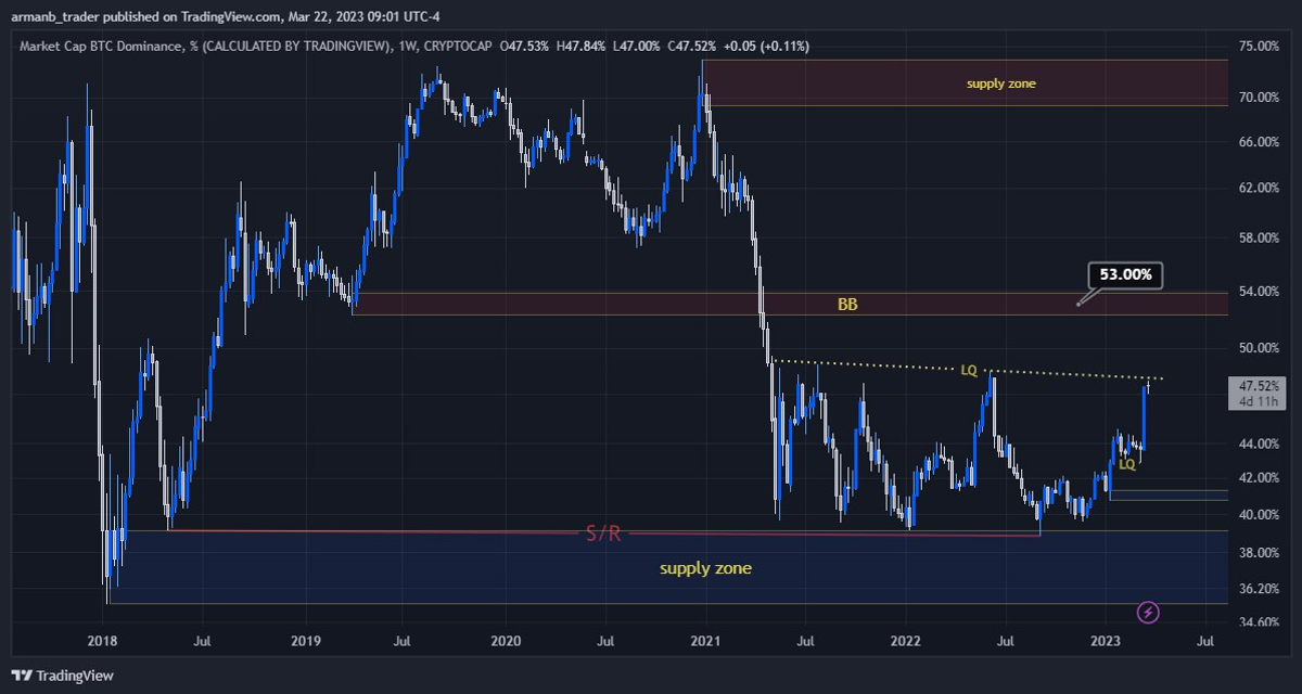 ولی در تایم هفتگی احتمال رشد این دامیننس تا محدوده 53% وجود دارد.