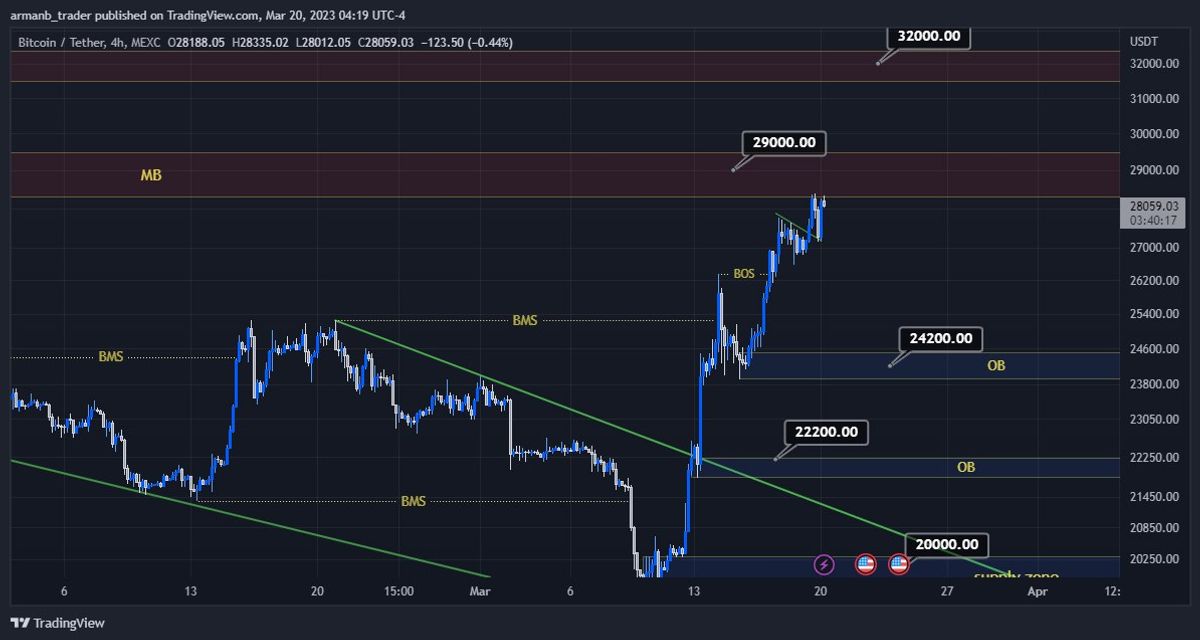 قیمت بدون اصلاح خاصی به روند صعودی خودش ادامه داده و به محدوده مقاومتی 29000 دلار رسیده.