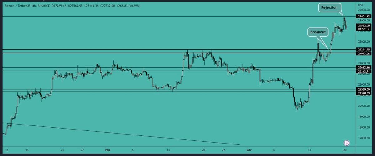 بیت کوین در تلاش که سطح مقاومت 28630 دلاری را آزمایش کنه و از آنجا رد بشه. اگه این اتفاق بیفته به اهداف بالاتر میتونه برسه برای چند روز شاهد معاملات در این محدوده و سپس آزمایش دیگری از ناحیه مقاومت باشیم. پشتیبانی اصلی 24800 تا 25300 دلار است.
