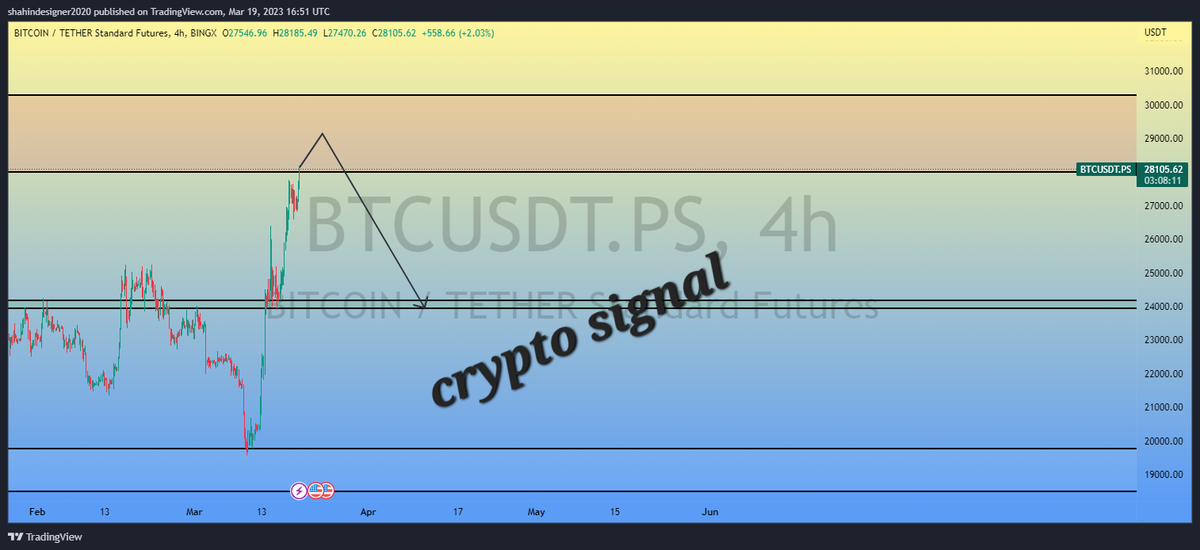 بیتکوین در ناحیه 29100 اسکلپ شورت دارد . در صورت تایید بین 27900 تا 29300 شورت باز کنید . بالا رفتن هیجانی هست . دوستانی که تو کانالم هستند شورت بیتکوین با تاچ کردن تارگت اول . اعلام اینپالس خرید را دادم (کاملا مشاهده کردند )