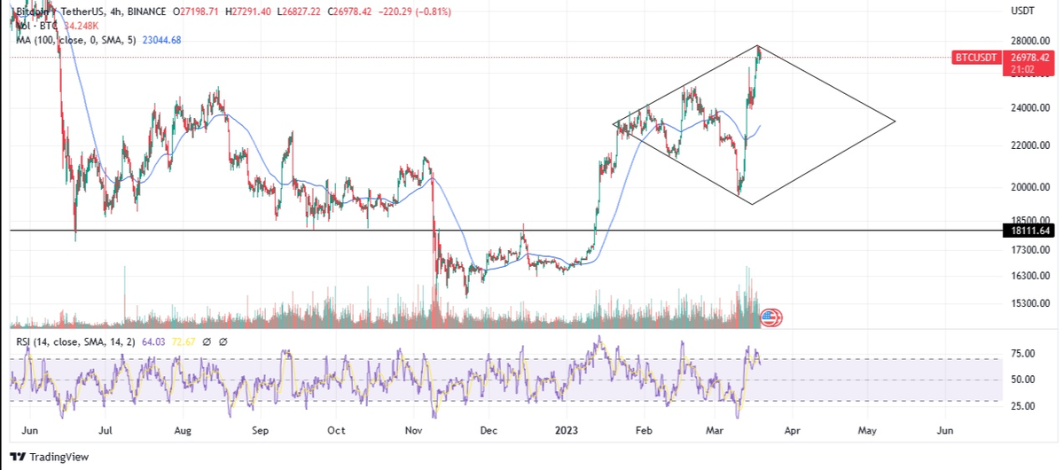 ثبت ATH جدید در تایم فریم روزانه یعنی حدود 28000 دلار با توجه به کف ثبت شده پایینتر از کف قبلی باعث سردرگمی و گیج شدن بازار گردید که به نظر میرسد تنها الگویی که ب ای این حرکت میتوان متصور بود، الگوی دیاموند ( لوزی) میباشد.