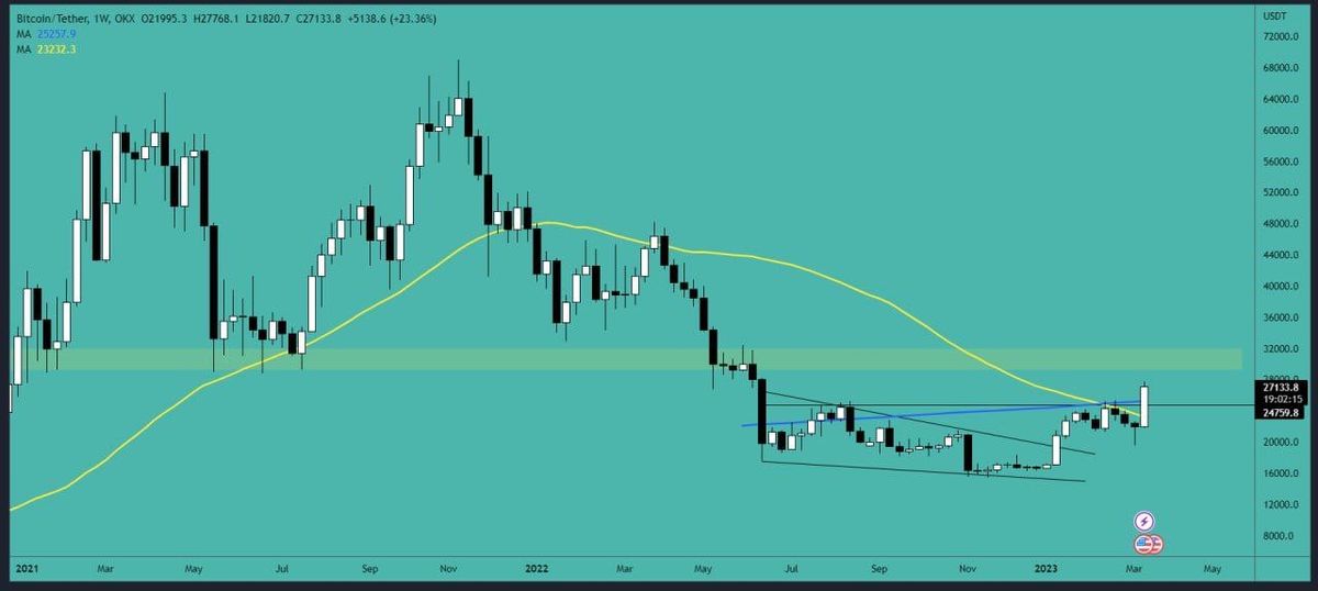شکست و رالی خوبی را به نمایش گذاشت. قیمت در حال حاضر بالاتر از 200 WMA (میانگین متحرک هفتگی) معامله می شود که نشانه خوبی است و قدرت را در بازار نشان می دهد. بسته شدن کندل هفتگی تأییدهای بیشتری را ارائه می دهد. مقاومت هفتگی بعدی منطقه 29000 تا 32000 دلار است و ممکن است شاهد سیو سود در این منطقه باشیم.