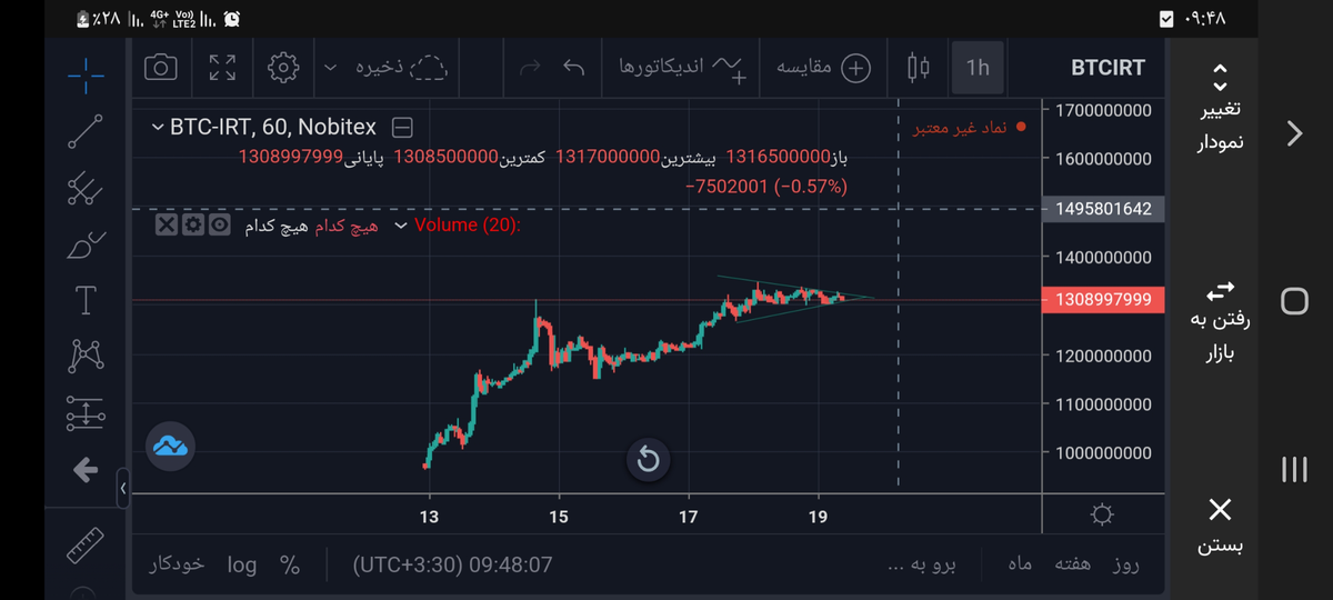 سلام بیت کوین در تایم نیم ساعته رویه حمایت سقف قبلی و تشکیل الگویی مثلث