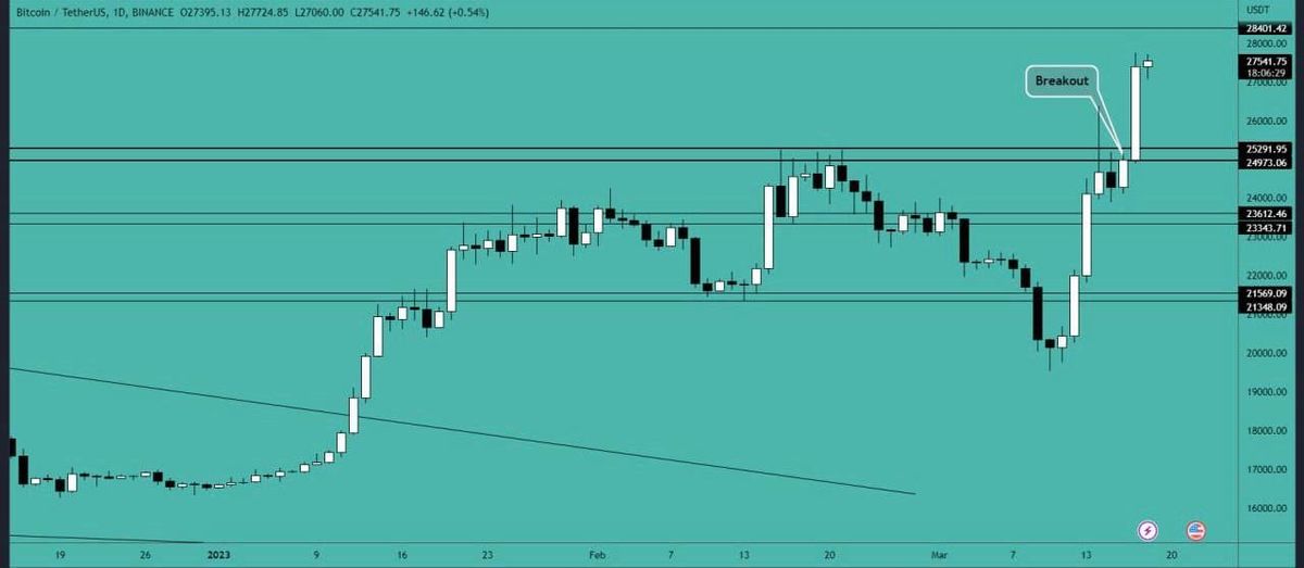 قیمت در حال حاضر به سمت مقاومت روزانه 28000-29000 دلار در حال حرکت است. ممکن است شاهد رد نشدن از ناحیه مقاومت و آزمایش احتمالی منطقه 26000 دلار باشیم. اگر بیت کوین بالاتر از 26000 دلار باشد ممکن است آلت کوین ها حرکت صعودی خوبی از خود نشان دهند.
