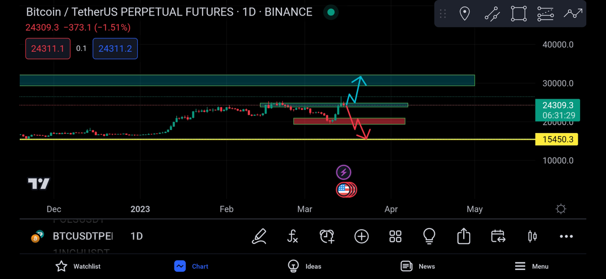اگر بتواند این ناحیه را بشکند و قیمت خود را بالای این ناحیه حفظ کند قیمت آن تا حدود ۳۰ تا ۳۲ هزار دلار صعود میکند
