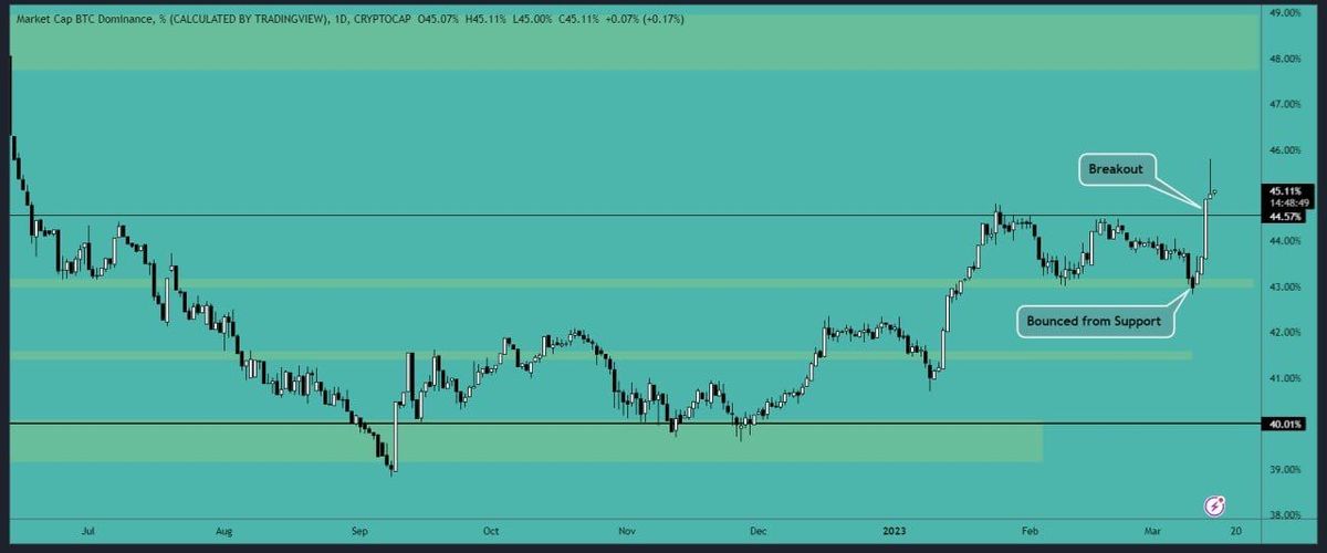 تسلط بیت کوین از سطح حمایت برگشت. تسلط با یک کندل سبز بزرگ سطح مقاومت را شکست. آلت کوینهایی که در جفت بیت کوین ریخته میشوند. ممکن است قبل از حرکت بعدی شاهد تست مجدد سطح حمایت 44.50-44.60 درصد باشیم. اگر بیت کوین به مدت 2 تا 3 روز در محدوده ثابت بماند، ممکن است شاهد حرکت صعودی در آلتکوین ها باشیم.