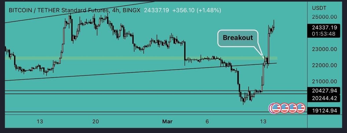 بیت کوین مقاومت 22500 دلاری را شکست و به حرکت صعودی ادامه داد. به دلیل تثبیت استیبل کوین ها، معاملات به بیت کوین تغییر می کند. همچنین سقوط بانک سرمایه گذاران را تشویق به سرمایه گذاری در ارزهای دیجیتال می کند. مقاومت اصلی در سطح 25000 دلار است و مراقب آن باشید.در صورت تثبیت بالای این سطح قیمتی انتظار رشد به اهداف بالاتر دور از انتظار نیست اما اگه نتونه این مقاومت بشکنه شاهد اصلاح قیمتی خواهیم شد