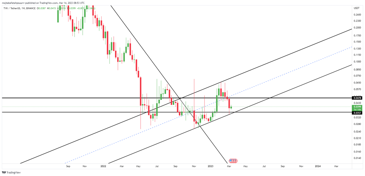 همانطور که در تصویر میبینید قیمت با حمایت قیمت 0.0357 برخورد کرد در صورت حفظ این حمایت تا قیمت 0.0478 صعود میکند در صورت شکست مقاومت قیمت 0.0478 میتواند ، تا حدود قیمت 0.0842 صعود میکند