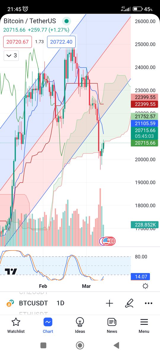 در تایم فریم یک روزه، بیت کوین با توجه به اینکه کف کانال صعودی خودش رو شکسته و اکنون این کف براش مقاومت محسوب میشه ، به زودی دوباره به عدد 23 کا برخواهد گشت ولی ماجرای اصلی به بعد از این پولبک موکول میشه که احتمال زیاد دوباره اصلاح قیمت خواهد داشت و باید فعلا محتاطانه عمل کرد.