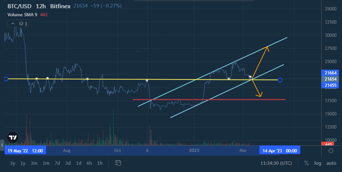 بیت کوین در این لحظه بر روی خط حمایت زرد هست و همچنان در کانال آبی سیر می کند در صورت شکست حمایت 21500 حمایت بعدی 17500 است و اگر حمایت شودتا 27500 صعودی