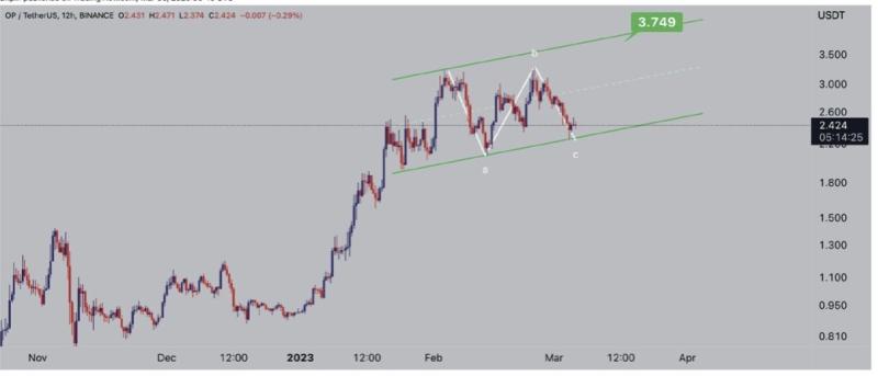 ارز OP در تایم فریم ۱۲ ساعته را در یک کانال مشاهده میکنیم که در حال حاضر در کف این کانال، قرار گرفته است. علاوه بر کانال فعلی، یک الگوی فلت هم دیده میشود و از همین محدوده، به احتمال زیاد، شاهد آغاز روند صعودی باشیم. در صورت رشد این ارز، تارگت اولیه محدوده ۳.۷ دلار است و بعد از شکست این محدوده، ما انتظار اهداف بالاتری را می توانیم داشته باشیم.