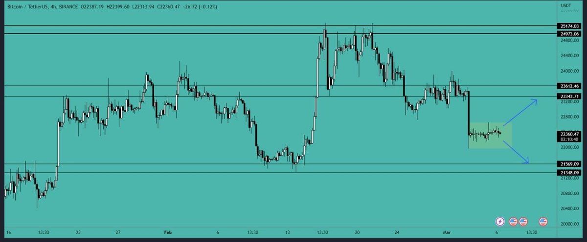 بیت کوین در محدوده حرکت می کند و ما به زودی شاهد شکست در هر دو طرف خواهیم بود. اگر قیمت محدوده را در جهت نزولی شکست، شاهد حرکت به سمت سطح حمایت 21300 تا 21600 دلار خواهیم بود. اگر قیمت محدوده را در جهت صعودی شکست، ما شاهد حرکت به سمت مقاومت منطقه 23350-23600 دلار خواهیم بود.