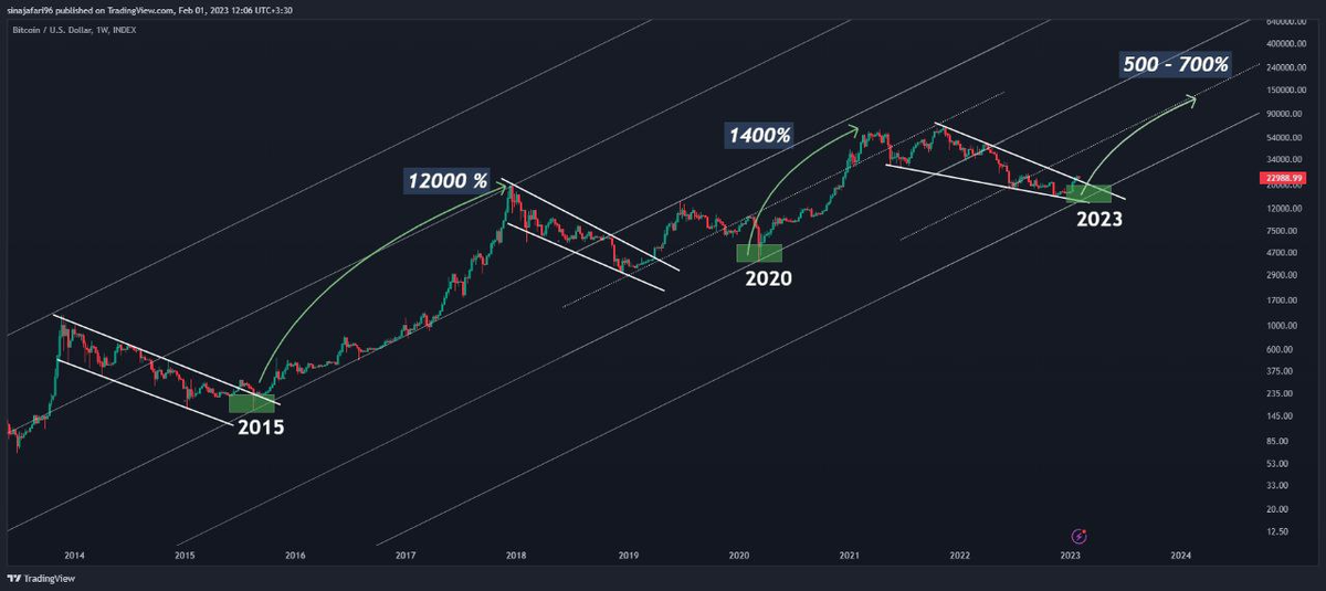 در سال 2023 حداقل اتفاقی که میتونه بیوفته، با توجه به این که تا هاوینگ بعدی بیتکوین هم فقط یکسال باقی مونده و معمولا چند ماه قبل از هاوینگ بازار صعودی شروع میشه، تشکیل یه کف معتبره.