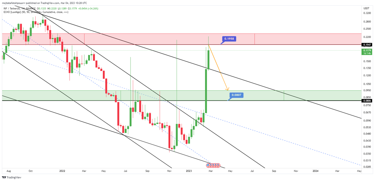 اگر محدوده قیمت 0.1325 الی 0.1250 نتواند حفظ شود، تا محدوده قیمتی سبز رنگ حدود قیمت 0.0953 الی 0.0807 اصلاح میکند .