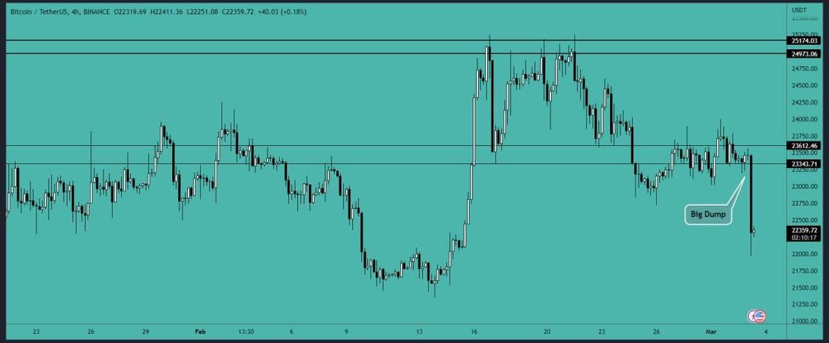 بیت کوین به شدت از سطح حمایت سقوط کرد. قیمت پشتیبانی در سطح 22000 دلار است و باید این سطح را حفظ کند. اگر بازار به زیر سطح 22000 دلار برسد، حرکت نزولی بیشتری خواهیم داشت. استاپ را در تمام معاملات قرار دهید.