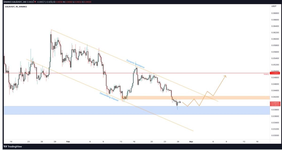 اخیراً گالا از سطح مقاومت هفتگی خود در منطقه 0.05 دلار شکست خورده است. با این حال، از آن زمان، بازار یک کانال نزولی تشکیل داده است که نشان می دهد قیمت در حال حاضر روند نزولی را تجربه كرده.