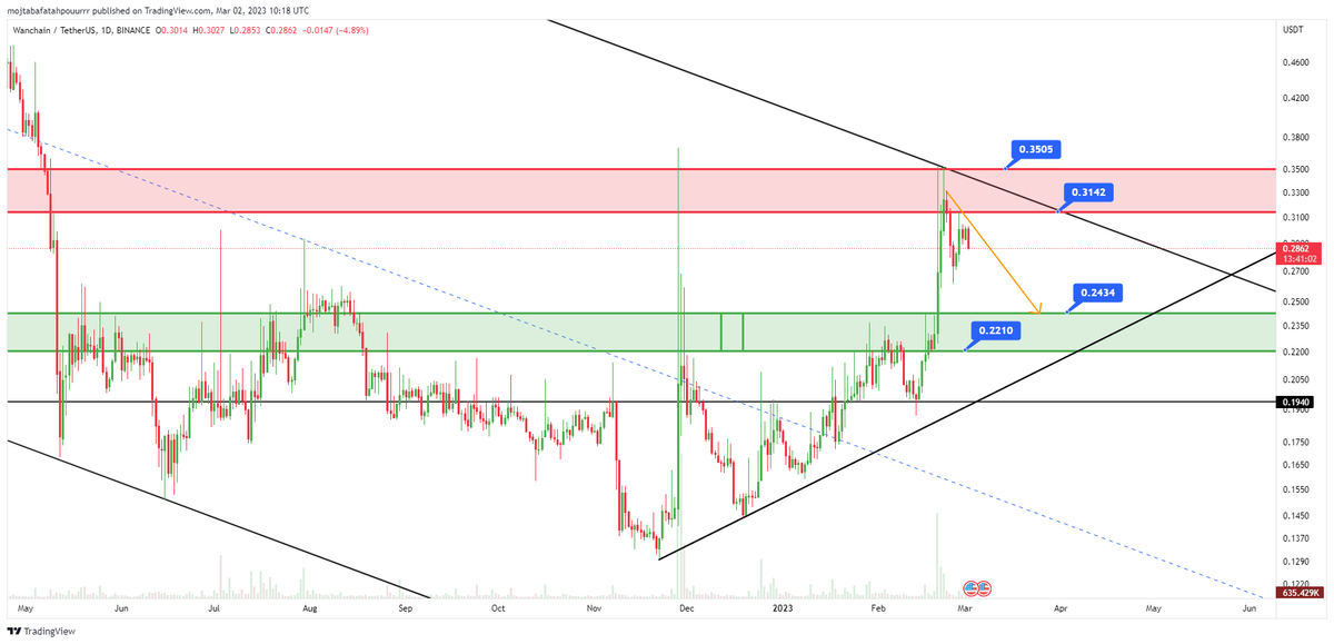 اگر حمایت سبز رنگ حدود قیمت 0.2210 الی 0.2434 حفظ شود دوباره به سمت مقاومت قرمز رنگ حدود قیمت 0.3142 الی0.3505 حمله میکند .