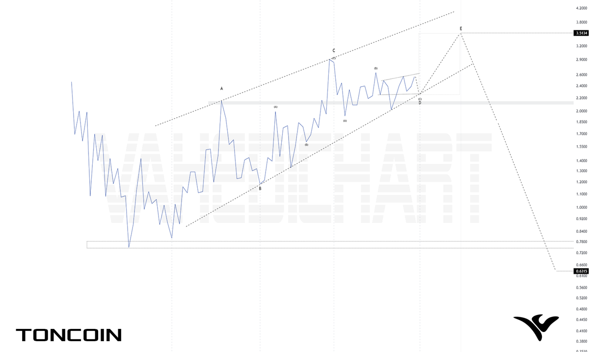 با توجه به اصلاحی بودن امواج و هم پوشانی موج B و D الگوی بزرگ یک مثلث همگرای کانتر است دقت شود ریزش در الگو های کانتر قدرت کمتری دارد و میتواند حتی باعث زدن کف قیمتی جدید نشود و کل الگو بیش از 0.618 اصلاح کند تارکت این نوع الگو ها 75 تا 125 درصد بزرگترین موج که موج A میباشد است