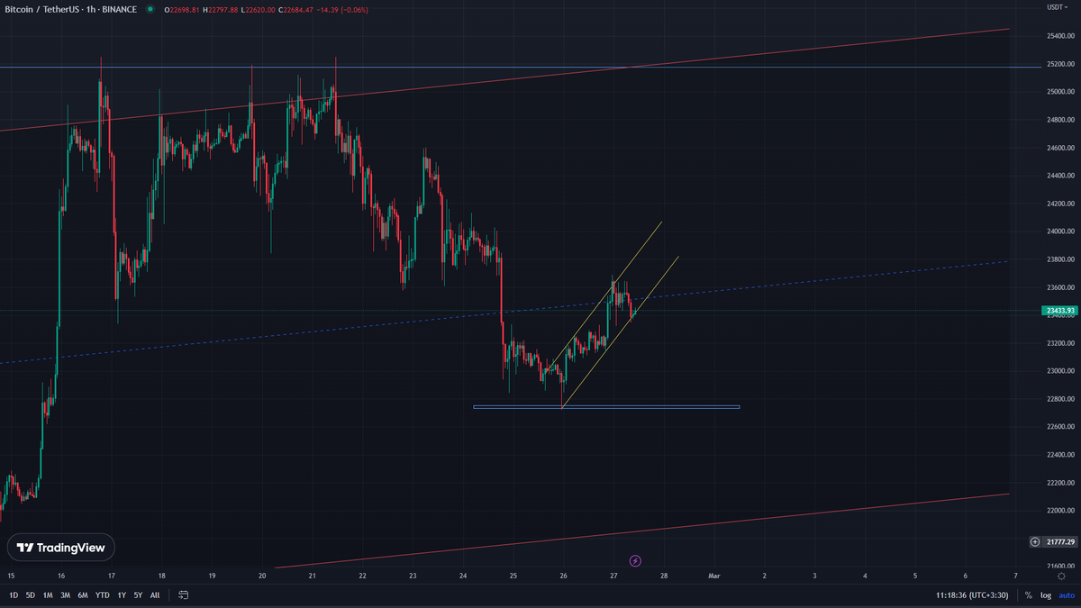 قیمت بیت بعد رسیدن به 22730 یک الگوی خلاف جهت روند تشکیل داد با توجه به ماهیت این الگو ادامه روند نزولی پیش بینی میشود در صورت بریک 22730 قیمت با قدرت بیشتری به ادامه روند نزولی ادامه میدهد. دوستان این یه دیدگاه کلی هست سیگنال خرید فروش نیست