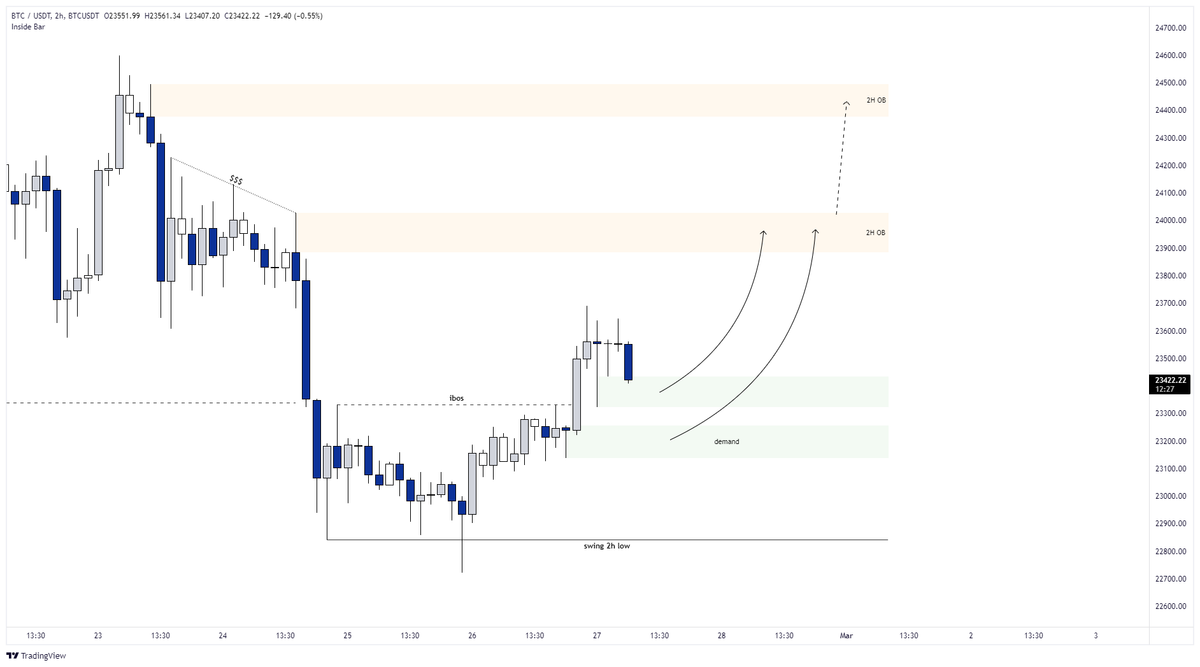 بیت کوین در تایم فریم دو ساعته ساختار صعودی تشکیل داده و انتظار دارم تا محدوده های عرضه مشخص شده حرکت کند.