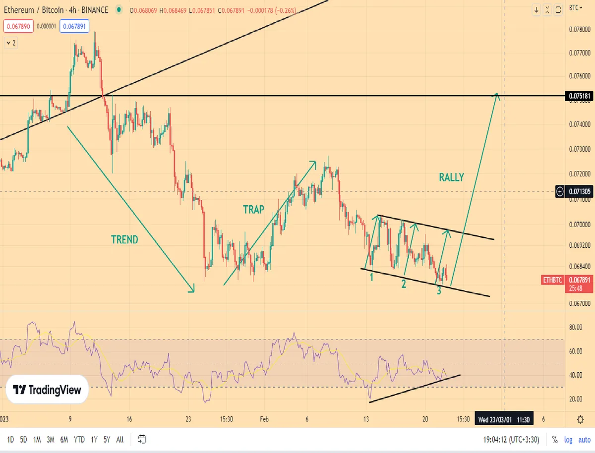 به نام خدا .سلام و وقت بخیر .......بررسی نمودار ETH/BTC در تایم 4 ساعته خبر از احتمال چرخش روند و از سر گیری یک رالی قیمتی است. ما طی روندی نزولی از 0.077 ساتوشی به 0.067 ساتوشی رسیدیم. گاوهها طی ایمپالس صعودی قیمت رو به محدوده 0.07 ساتوشی رساندند. اما فروشندگان (خرس ها) در ادامه باعث ایجاد تله (TRAP) شده و برای شکار حد ضرر گاوها قیمت رو بار دیگر به محدوده 0.067 رساندند.مشاهده میکنید داخل یک فلگ 2 تلاش خریداران برای بازپس گیری قدرت از فروشندگان به شکست خورده اما به نظر میرسه خریداران در تلاش سوم برای شکست سقف این فلگ و ایجاد رالی در مواجهه با سد سست فروشندگان و ایجاد موج صعودی قوی در ادامه موفق بشوند.همچنان که شاهد ایجاد واگرایی مثبت در RSI نیز هستیم. مطالعه این نمودار و بررسی اون به شما به عنوان تحلیل بین بازاری (BTC)و همچنین بررسی دقیق تر روند شاخص TOTAL 2 کمک خواهد کرد.