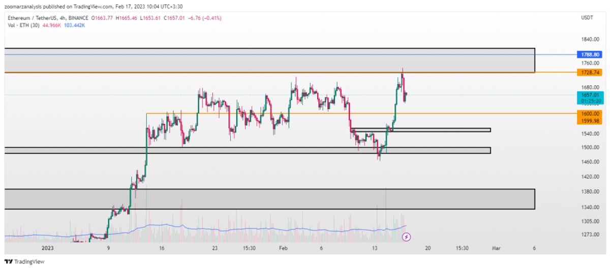 با ادامه روند صعودی اتریوم و تشکیل سقف جدید در تایم فریم 4 ساعته، قیمت به محدوده 1727 الی 1808 دلار برخورد کرد. این مقاومت از چند هفته گذشته روی نمودار اتریوم به عنوان یک ناحیه عرضه قوی در نظر گرفته شده بود، که بعد از مدت زمان 6 ماه مجددا قیمت به این محدوده برخورد کرد.