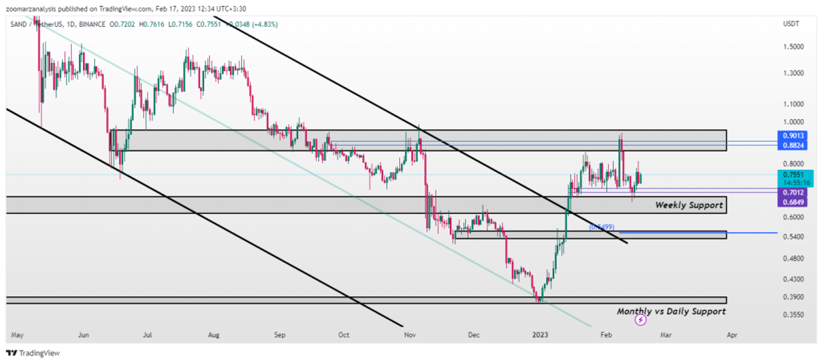 ارز دیجیتال سندباکس در طی هفته گذشته روند صعودی قوی داشت، و با حفظ حمایت محدوده 0.70 دلار، یک موج صعودی قوی در تایم فریم روزانه ایجاد کرد. شکست سقف قبلی تایید شده است، اما به دلیل اینکه برخورد قیمت به مقاومت مشخص شده در محدوده 0.90 دلار اتفاق افتاده است، واکنش شدیدی صورت گرفته است.