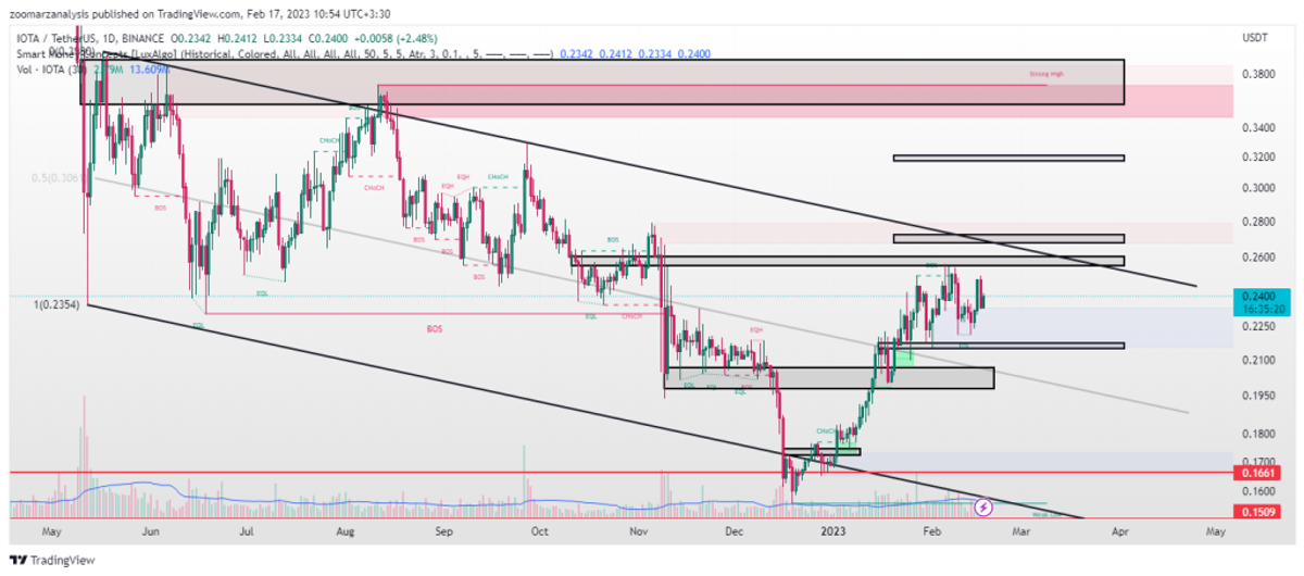 ارز دیجیتال آیوتا روند کاملا رنجی را روی نمودار ثبت کرده است، و بعد از روند صعودی قوی در ماه های قبل، حجم معاملات این ارز کاهش پیدا کرده است. سطح مقاومتی که در محدوده 0.255 الی 0.260 دلار برای این ارز در نظر گرفته شده بود، هنوز شکسته نشده است، و هر برخوردی به این ناحیه با واکنش منفی همراه می شود. قیمت این ارز به دلیل برگشت خوبی که از محدوده کف کانال نزولی ممیان مدت داشته، پتانسیل رشد بیشتر را حداقل تا سقف کانال دارد.
