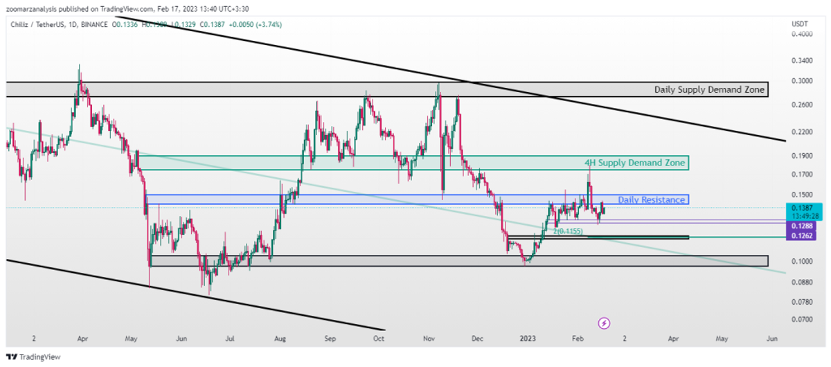 ارز دیجیتال چیلیز در طی هفته گذشته نوسانات بسیار شدیدی داشت. کندل هفته گذشته این ارز یک کندل نزولی که الگوی کندلی شهاب سنگ را زیر مقاومت 0.15 دلار نشان می دهد، و پتانسیل کاهش بیشتر را در ادامه روند نشان می دهد. با ایجاد فشار فروش در بازار، قیمت این ارز کف کانال صعودی کوتاه مدت را شکست، و روند آن همزمان در تایم فریم 4 ساعته و روزانه نزولی شد. با توجه به مقاومتی که در محدوده 0.141 الی 0.150 دلار در نظر گرفته شده است، و همچنین شکستی که در محدوده 0.126 الی 0.130 دلار ایجاد شده است، می توانیم انتظار کاهش بیشتر قیمت را تا سطح حمایت بعدی در محدوده 0.115 دلار داشته باشیم. این ناحیه به دلیل اینکه با میدلاین کانال نزولی اصلی همپوشانی پیدا کرده است، پتانسیل واکنش مثبت قوی تری دارد. به طور کلی روند این ارز در محدوده های مختلفی از نمودار رنج می باشد، و در کوتاه مدت نمی توانیم انتظار افزایش قیمت را داشته باشیم.