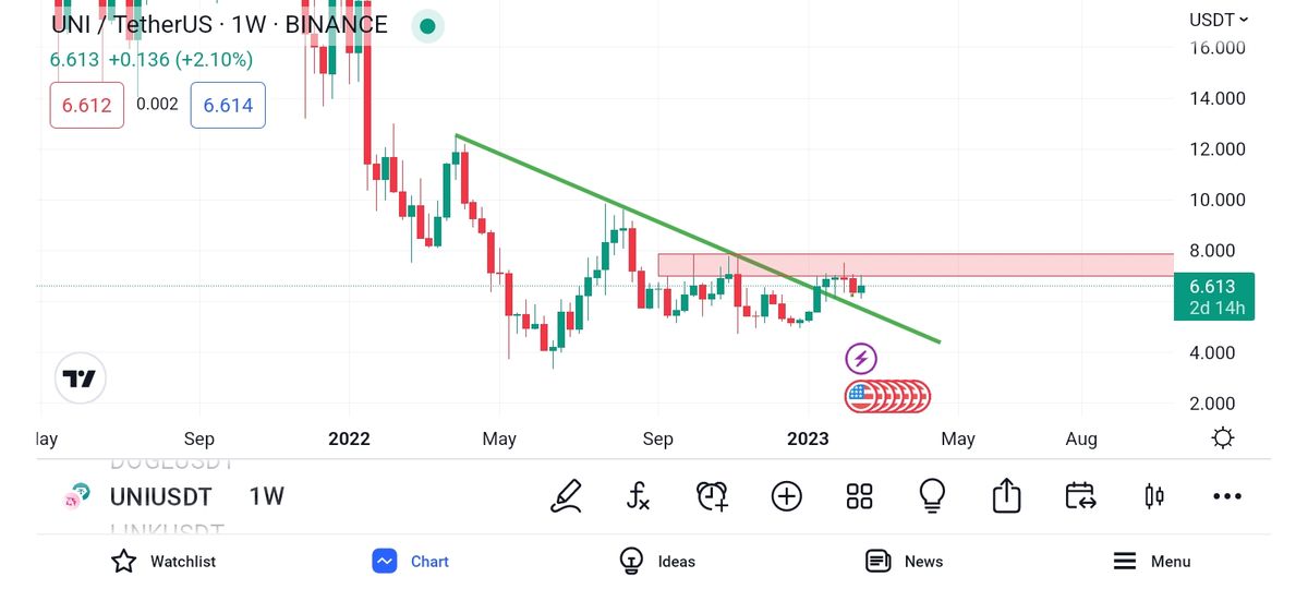 سلام ارز یونی سواپ درصورتی که بتواند قیمت بالای محدوده رسم شده تثبیت کند سناریو صعودی خواهد بود اما اگر نتواند بالای این محدوده تثبیت کند و قیمت به زیر خط روند برگردد روند نزولی خواهد شد