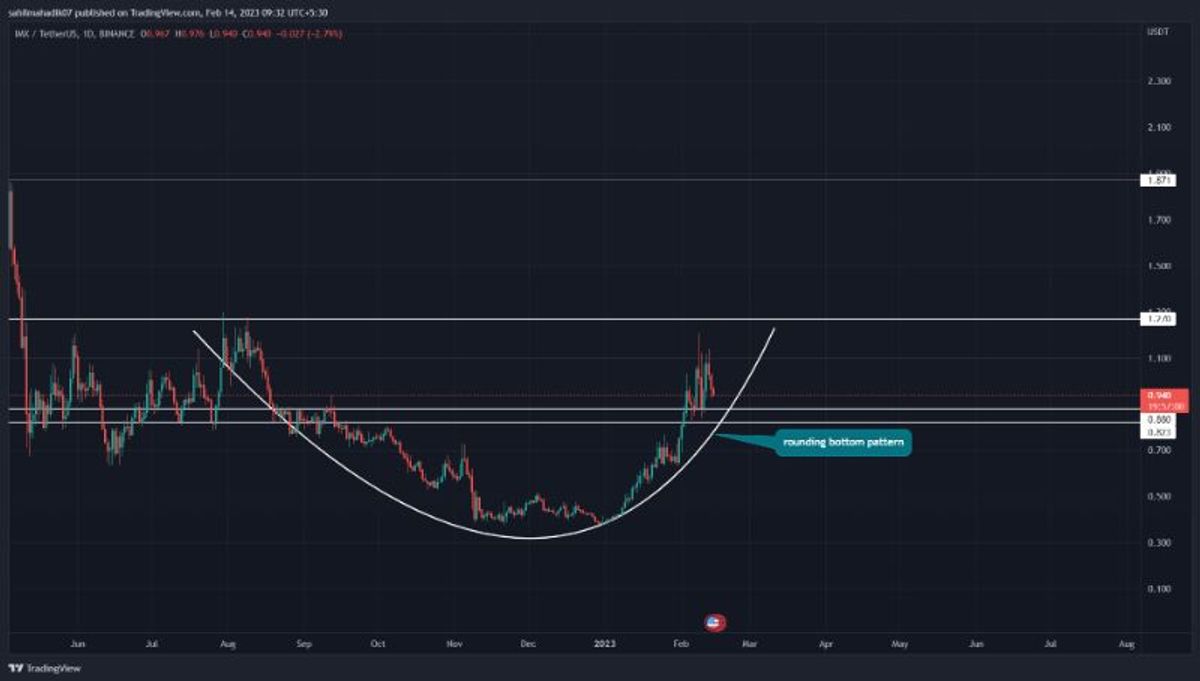 ارز دیجیتال ایموتبل ایکس در حال تشکیل یک الگوی کف گرد در نمودار تایم فریم روزانه است. این الگوی معکوس صعودی، سیگنالی برای بهبود پایدار و تغییر روند تلقی میشود. در حال حاضر، IMX در محدوده ۰٫۹۵ دلار معامله میشود و همچنان بالاتر از سطح حمایتی بازیابیشده ۰٫۸۸ تا ۰٫۸۲ دلار قرار دارد.