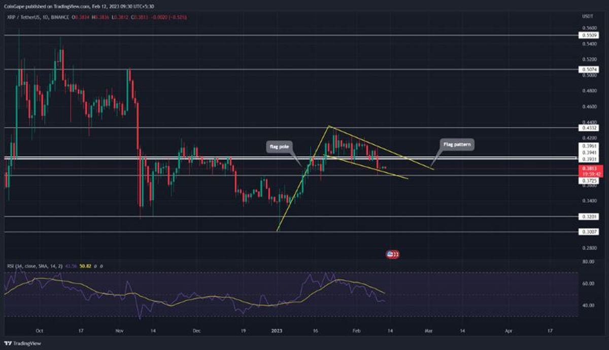 در نمودار قیمت ارز دیجیتال XRP و در تایم فریم روزانه، شکلگیری یک الگوی پرچم مشاهده میشود. بنابراین، اصلاح مداوم قیمت این رمزارز میتواند بخشی از الگوی مذکور باشد که هدف آن، بازیابی مومنتوم صعودی است.