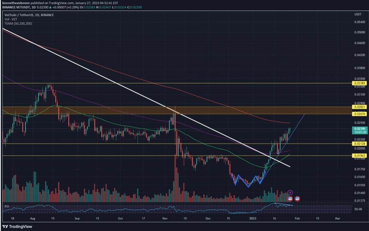 وی چین در منطقه خوبی قرار داره در کانال صعودی خودش در حال حرکته یک مقاومت0.02676 پیش رو داره درصورت شکست اهداف0.03385 دنبال میکنه موفق باشید