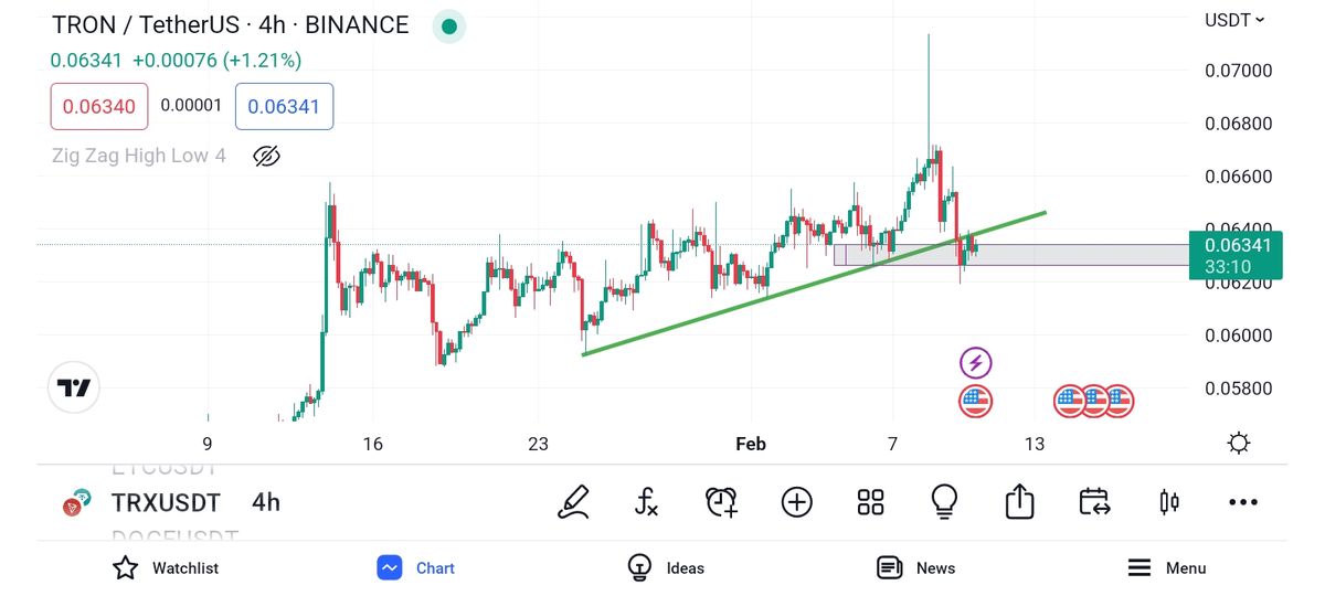 سلام ارزترون پس ازآنکه خط روند صعودی خودراشکست الان درحال پولبک به خط روند می باشد درصورتی که قیمت پایین محدوده رسم شده تثبیت کند سناریو نزولی خواهد بود اما اگر قیمت بالای خط روند بروددوباره روند صعودی خواهد شد