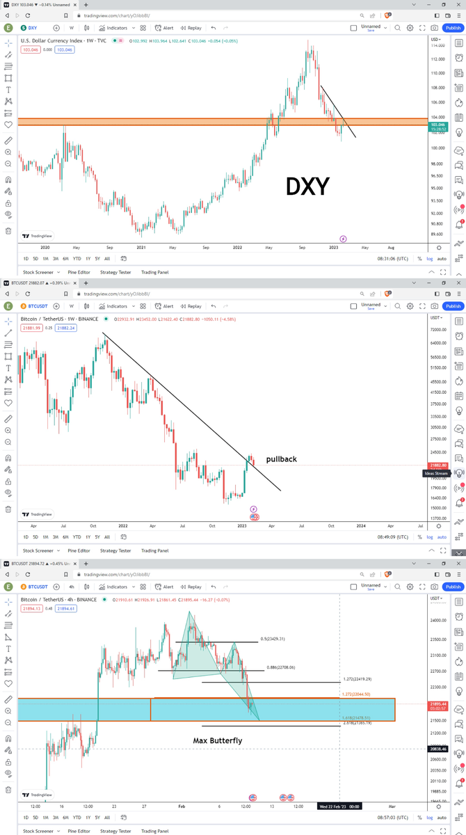 عکس سوم تحلیل بیت کوین در تایم فریم ۴ ساعته هست الگوی مکس باترفلای در حال تشکیله طبق این الگو محدوده ۲۱۵۰۰ تا ۲۲۰۰۰ محدوده برگشتی بیت کوین هست که با ناحیه پولبک هم همخوانی داره از همین محدوده میتونیم رشدی رو تا محدوده ۲۶ الی ۲۷ داشته باشیم