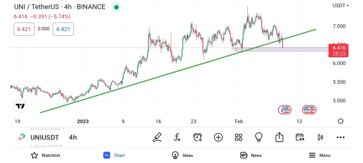 سلام ارز یونی سواپ پس ازآنکه خط روند صعودی خودرا درتایم فریم ۴ساعته شکست الان درگیرمحدوده رسم شده که قبلابه عنوان یک کف صعودی برای قیمت بوده است هست درصورتی که قیمت پایین محدوده رسم شده تثبیت دهد روند نزولی خواهد بود اما درصورتی که قیمت نتواند سطح رسم شده را بشکند باید منتظرباشیم قیمت به بالای خط روند برگردد
