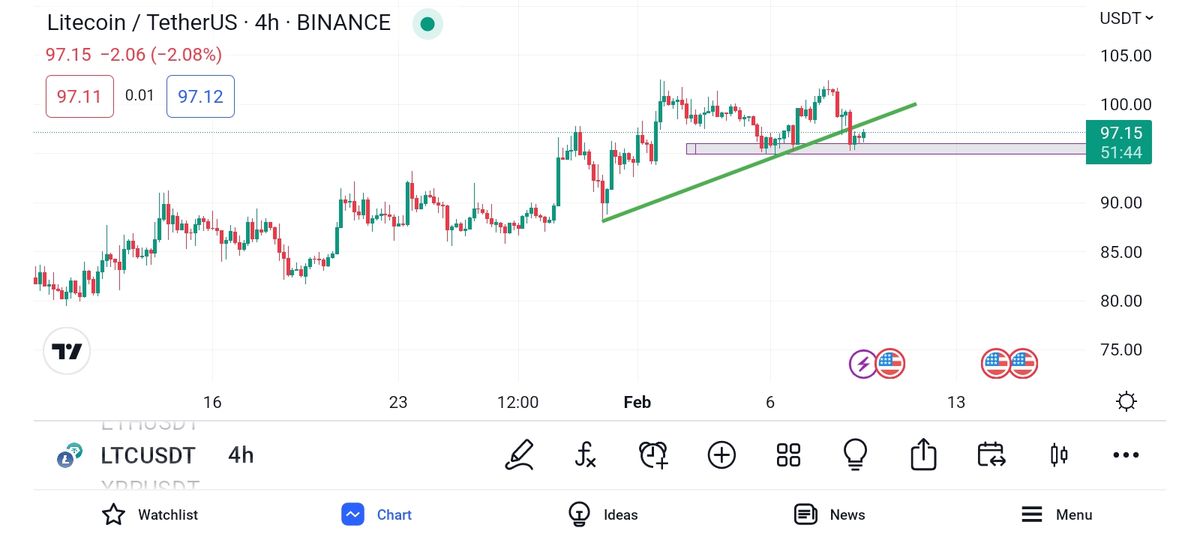سلام ارز لایت کوین پس ازآنکه خط روند صعودی خودراشکست الان درگیرآخرین کف قیمتی خودمی باشد درصورتی که قیمت پایین محدوده رسم شده تثبیت کند سناریونزولی مطرح می شود اما اگرقیمت دوباره به بالای خط روند برگردد دوباره روندصعودی انتظارمی رود