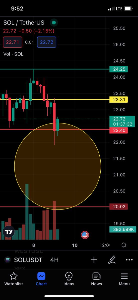 در صورتی که امروز سولانا قیمت ۲۲.۴۰ رو بشکنه و کندل زیر این قیمت باز بشه هدف بعدی ۲۰.۰۲ هست اما در صورتی که بالای ۲۴.۴۰ بسته بشه بازار حرکت اصلاحیه خودش رو انجام داده و میره که ۳۰ دلار رو تاچ کنه … صرفا این نظر و تحلیل شخصی هست